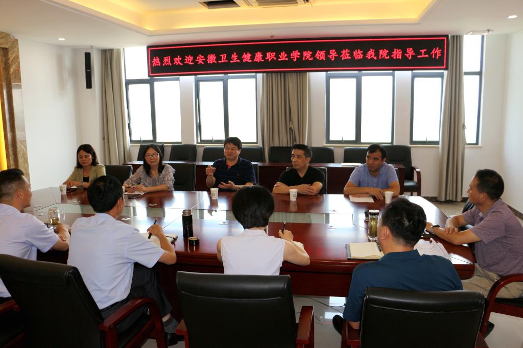 皖西卫生职业学院党委副书记、院长夏跃武,副院长方士英及相关部门负责人对张兵院长一行表示热烈欢迎。双方进行了深入座谈交流,夏跃武详细介绍了皖西卫生职业学院的基本概况、系部设置、人才培养、师资队伍建设、学院附院及二期工程建设等情况。方士英介绍了该校的专业建设、技能型高水平大学建设等情况,希望两校持续加强互动和交流,开展多方面合作,共同提高办学水平。